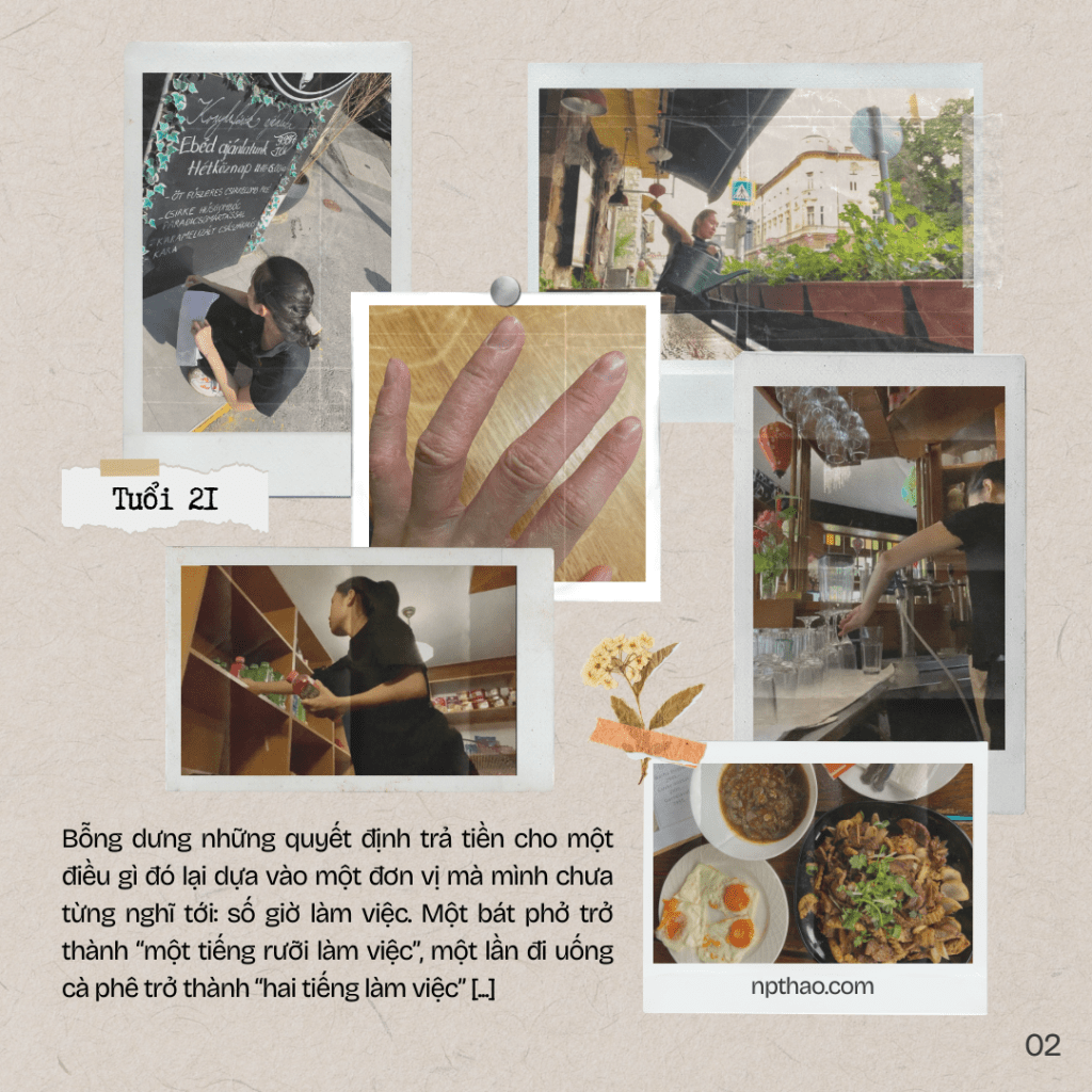 Công việc này làm cách chi tiêu của mình thay đổi rất nhiều. Bỗng dưng những quyết định trả tiền cho một điều gì đó lại dựa vào một đơn vị mà mình chưa từng nghĩ tới: số giờ làm việc. Một bát phở trở thành “một tiếng rưỡi làm việc”, một lần đi uống cà phê trở thành “hai tiếng làm việc, và một chiếc áo cũng trở thành “bốn tiếng làm việc”.