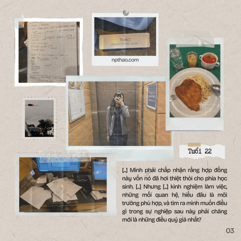 Tất cả những điều phía trên là để đổi lại mình được ở đây học hỏi về ngành khách sạn, hiểu những phòng ban mình tiếp xúc vận hành như thế nào, và có những đồng nghiệp tốt, yêu nghề. Đi làm ở đây 9 tháng, điều quý giá nhất chính là mình hiểu môi trường này không dành cho mình, và mình tìm ra chủ đề cho bài luận văn ra trường: sự phục hồi và phát triển của ngành khách sạn sau đại dịch. Từ giờ, mình sẽ hỏi về môi trường làm việc kỹ hơn trong các buổi phỏng vấn và đọc hợp đồng cẩn thận hơn trước khi ký. Nếu có quay lại thời điểm nhận công việc này, mình chắc chắn vẫn sẽ đồng ý lời mời của công ty, chỉ là có thể mình đã quản lí sự kỳ vọng của bản thân tốt hơn. Mình hiểu là không phải là công việc nào cũng trả lương công bằng, nhưng khi mình còn rất trẻ thì tiền chưa phải là ưu tiên lớn nhất. Kinh nghiệm làm việc, những mối quan hệ, hiểu đâu là môi trường phù hợp, và tìm ra mình muốn điều gì trong sự nghiệp sau này phải chăng mới là những điều quý giá nhất?