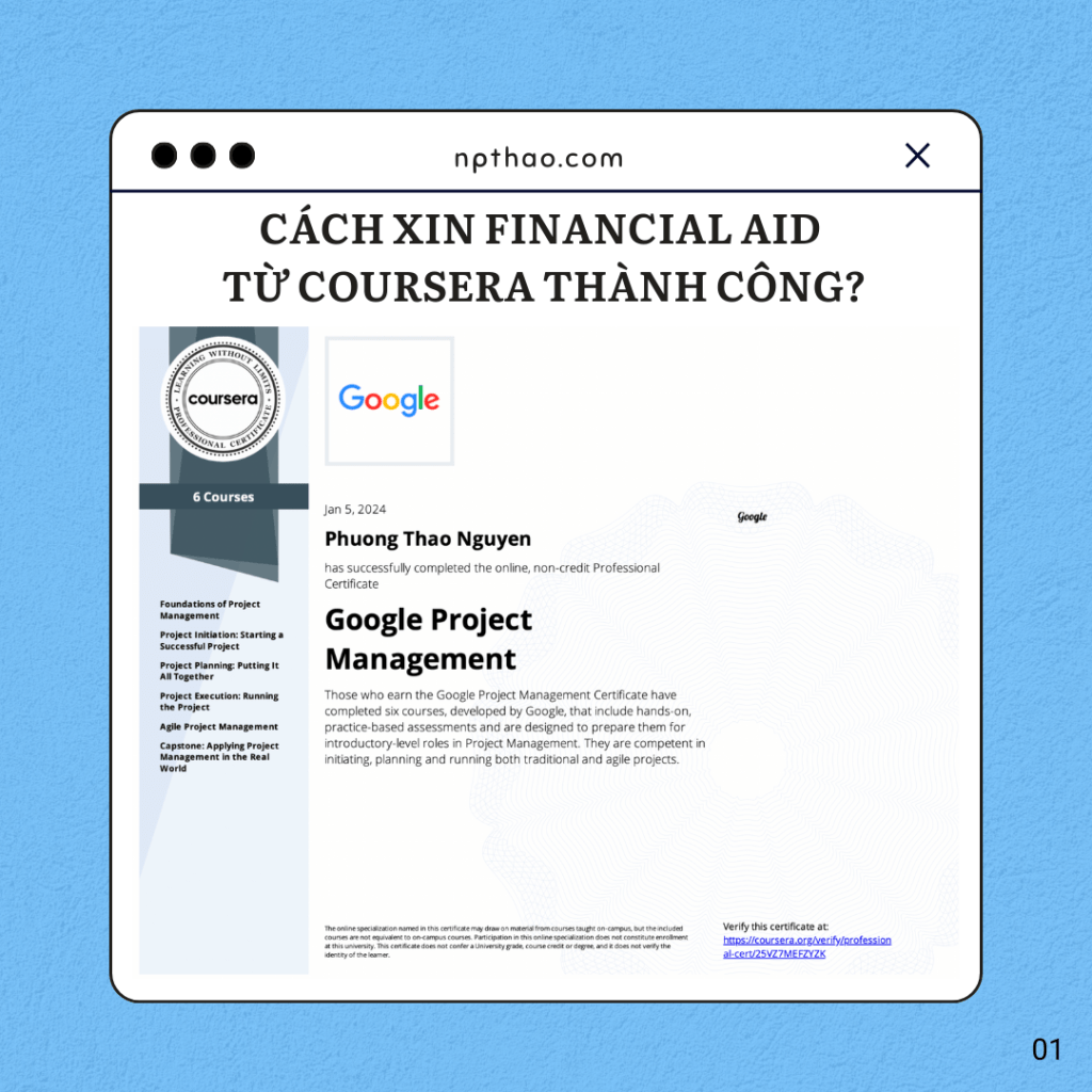 Mình tin rằng ai trong chúng ta cũng khao khát được phát triển chính mình. Trong hành trình tự học và nâng cao trình độ, việc tận dụng các tài nguyên học trực tuyến như Coursera (gồm Audit Course và Financial Aid) là bước đi đầu tiên và quan trọng để thúc đẩy sự phát triển bản thân và mở ra cánh cửa của kiến thức mới. Mình viết bài blog ngày hôm nay với mong muốn nó có thể trở thành “cuốn cẩm nang” cho mọi người khi quyết định học và đạt được các chứng chỉ online. (Năm 2023 mình đã xin Financial Aid thành công 10 khoá học để được cấp chứng chỉ miễn phí từ Coursera). Dưới đây sẽ là những hướng dẫn chi tiết mà mình góp nhặt được từ chính kinh nghiệm cá nhân học online suốt thời gian qua. Nội dung chính của bài blog sẽ gồm những phần sau: