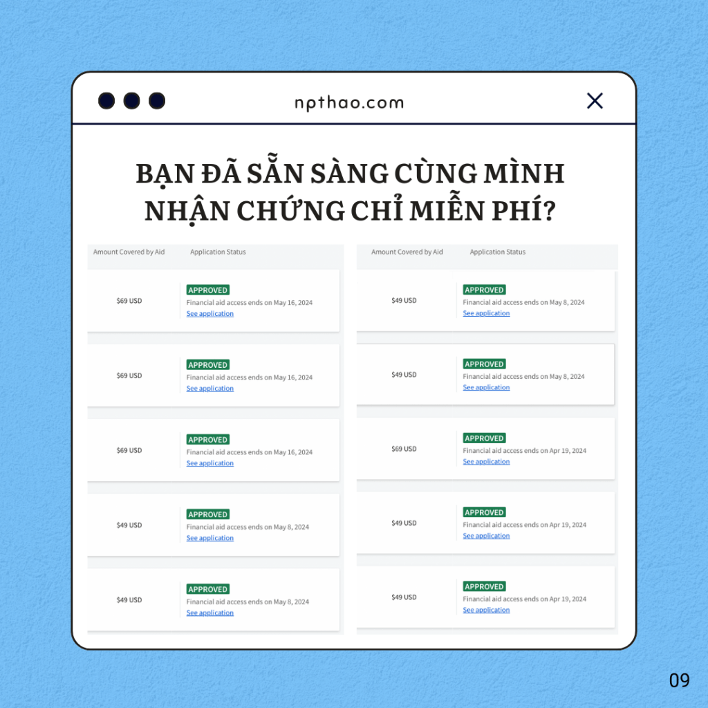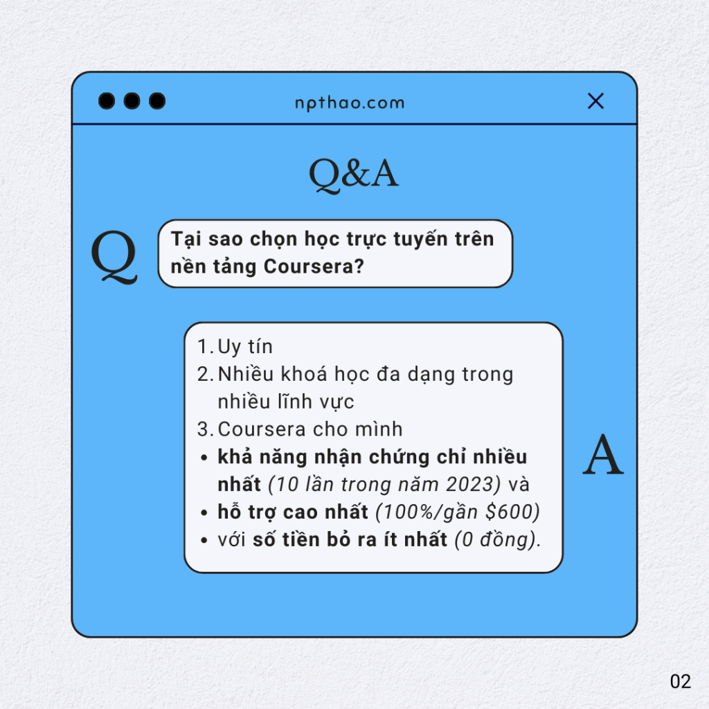 3. Và điều quan trọng không kém đấy là việc mình có thể xin hỗ trợ tài chính (Financial Aid) một cách thành công nhiều lần để được cung cấp chứng chỉ miễn phí. Là là một người trẻ cần minh chứng về việc mình thực sự có dành thời gian và công sức để trau dồi bản thân cho những kỹ năng nghề nghiệp quan trọng, thì việc được nhận chứng chỉ là có quan trọng với mình. Tất cả các nền tảng trên đều có thể mang lại kiến thức, nhưng Coursera là nơi cho mình khả năng nhận chứng chỉ nhiều nhất (10 lần trong năm 2023) và hỗ trợ cao nhất (100%) với số tiền bỏ ra ít nhất (0 đồng). Mình nghĩ đơn giản là: Nếu đằng nào cũng cùng một công học cho ấm vào thân, tội gì không lấy chứng chỉ miễn phí? 😊