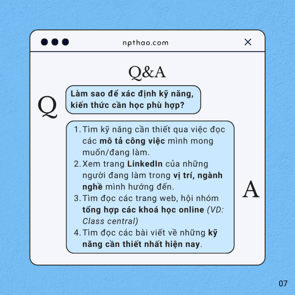 Ở đây không chỉ là để tìm hiểu công việc đó cần kỹ năng chủ đạo nào, mà còn là xem họ đã có những chứng chỉ nào, đạt được qua nền tảng hay các bài kiểm tra nào. Từ đó mình có thể chọn lọc và học chính những chứng chỉ đó. Nếu muốn chi tiết hơn nữa thì bạn có thể nhắn tin trực tiếp để hỏi họ rằng công việc hằng ngày của họ thực sự cần sử dụng những kỹ năng, phần mềm, dụng cụ nào.