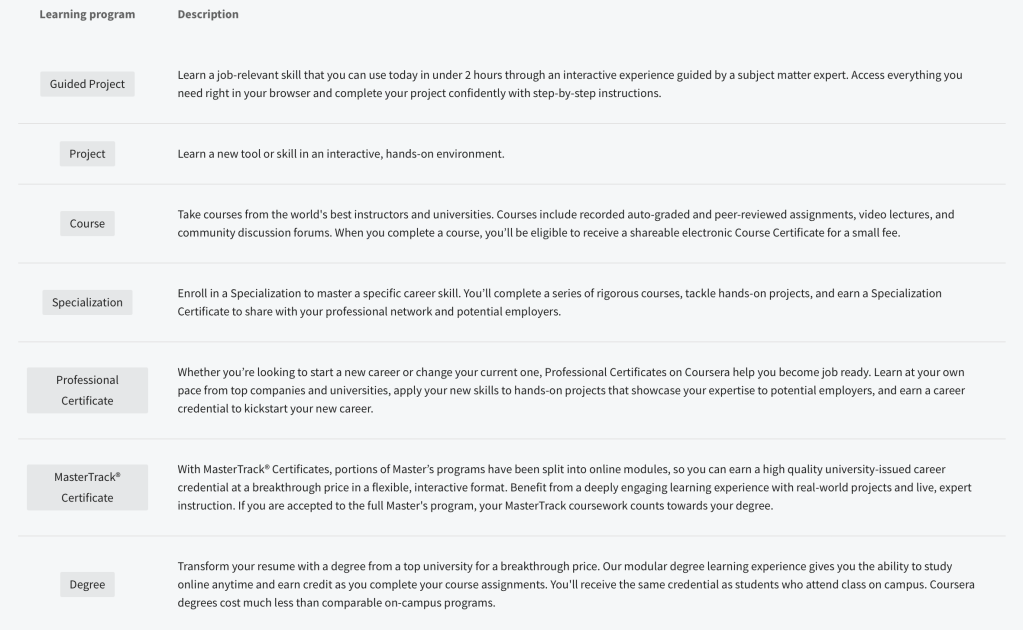 1. Các dạng chương trình học trên Coursera