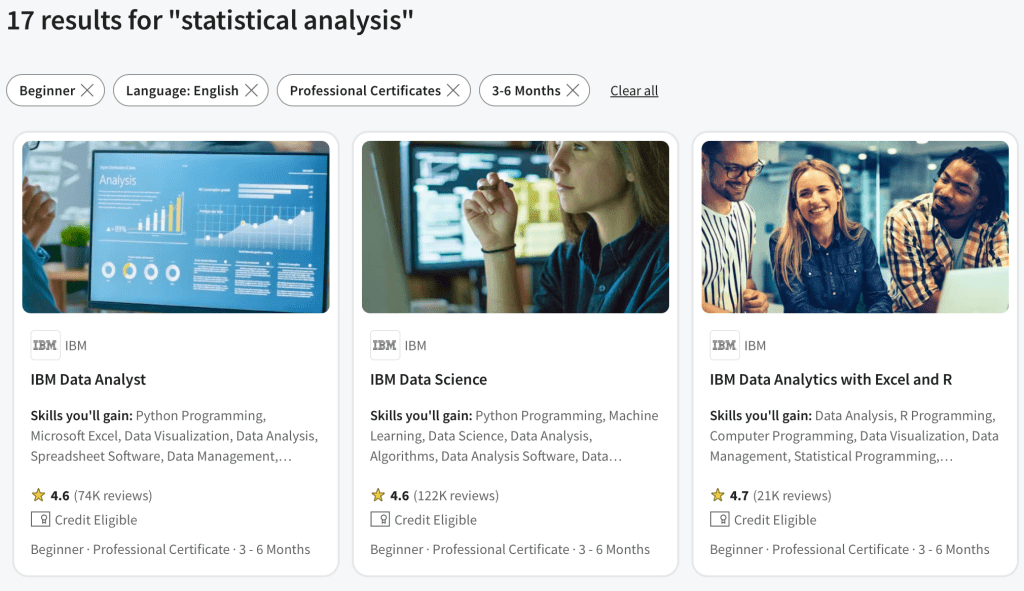 Ở trên Coursera họ cung cấp rất nhiều dạng chương trình học (Learning Product) với 4 mức độ: Beginner (Người mới bắt đầu), Intermediate (Trung cấp), Advanced (Nâng cao) và Mixed (Hỗn hợp) như hình dưới đây.